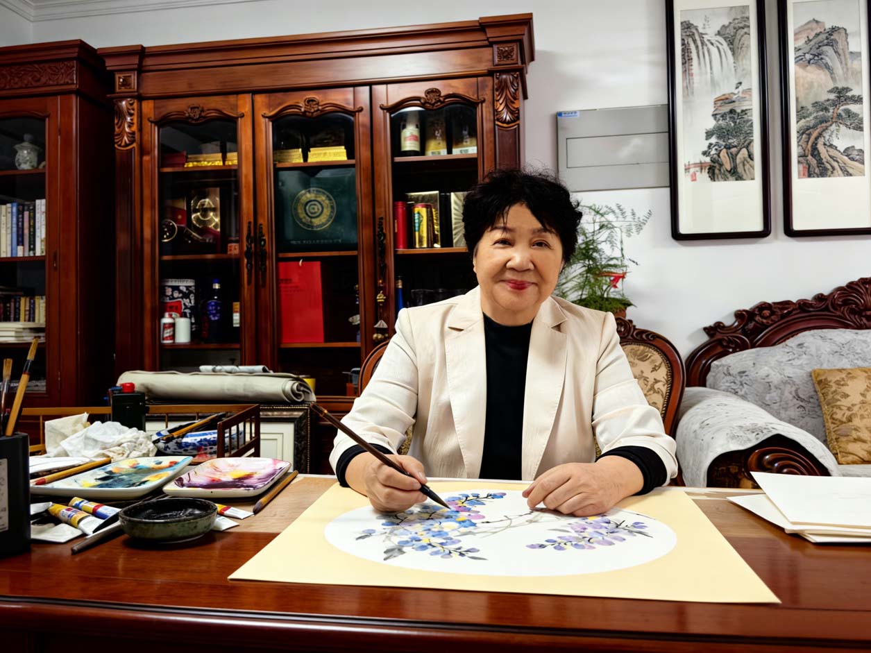 她始终坚守“传统不丢,时代同步”的创作理念,在传承古法的同时,积极创新求变。深谙明代“墨分五色”精髓,又融入岭南画派色彩特点,画牡丹时打破传统红花绿叶的俗艳局限,用浓淡枯湿的墨色表现叶片层次,搭配艳丽花瓣,兼具文人雅致与时代美感;面对元宇宙、数字化等新兴科技,她主动学习、紧跟时代,下载艺术数字平台,研究线上画展,让年轻群体通过数字媒介感受传统国画的魅力,真正做到活到老、学到老。
