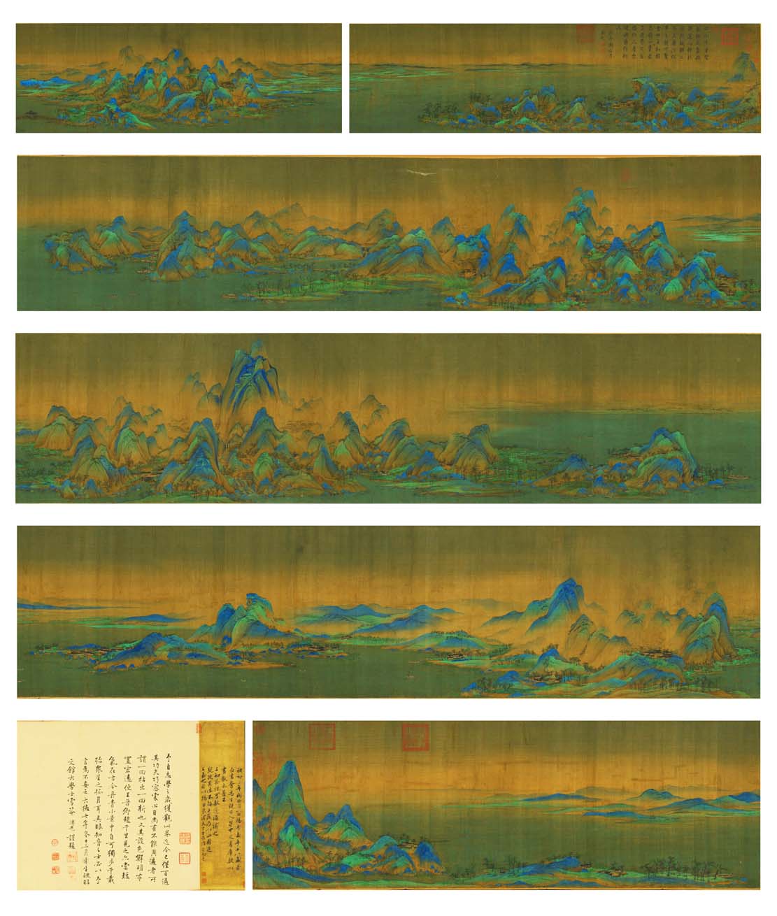 关于《千里江山图》的欣赏,一般采用“分段法”,因为此画长达近12米,分段比较易于观看和分析。正如杨新先生所说“无论截取哪一个段落,又都能构成相对独立的画面。” 陈丹青先生也讲,“如果把这幅画切割成无数个局部,每个局部都可以是一幅画,都是细节。”