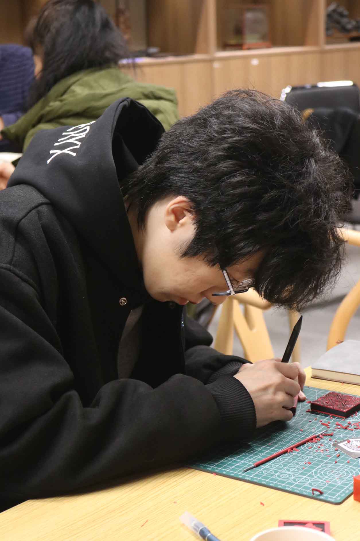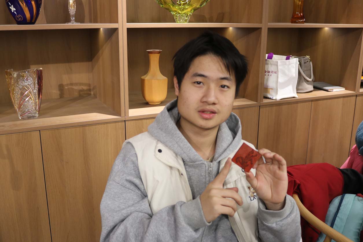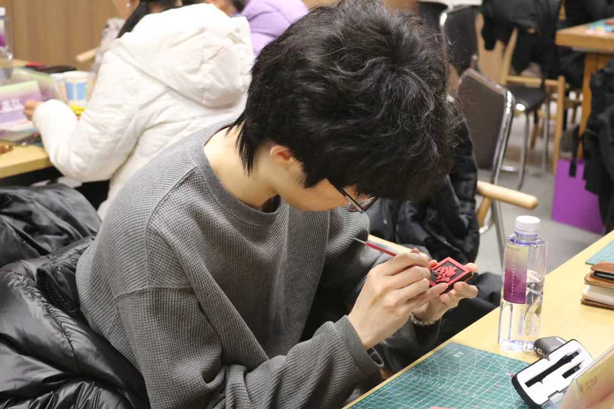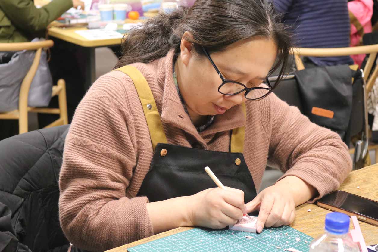 在技艺教学环节,朱江老师聚焦雕漆的完整工艺流程,从漆料制备、髹漆打底到雕刻塑形、打磨修饰,每一个步骤都结合实操细节细致拆解,尤其针对雕漆文字与锦纹的创作技巧展开专项指导。参与者在老师的带领下,亲身参与漆板雕刻实践,近距离感受雕漆 “慢工出细活” 的匠心所在,在动手实践中掌握核心技艺要点。