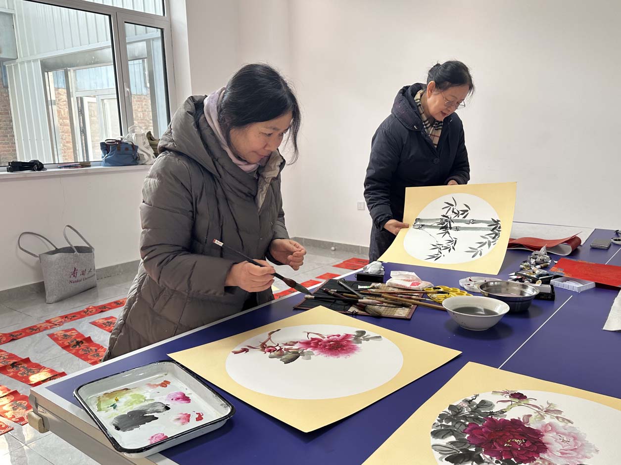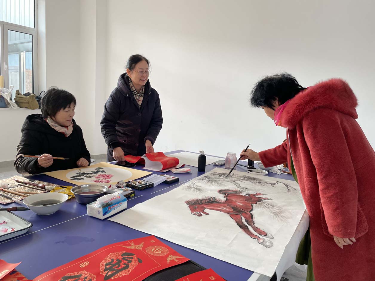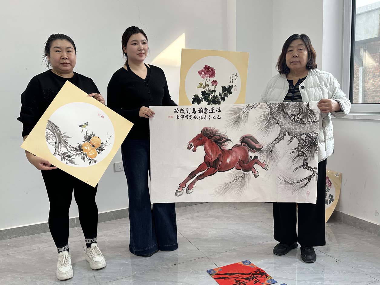 尤为亮眼的是书画院顾问张斌老师她挥毫绘就一匹昂首奔腾的红马,“鸿运当头,马到成功”,寓意新岁顺遂、福气盈门;随后又勾勒出“柿柿如意”的鲜活图景、“竹报平安”的清雅意境与包玉琴,王彦美二位秘书长“富贵牡丹”的雍容姿态,笔墨间尽显功底,每一幅画作都承载着真挚的新春祝福。墨香在现场缓缓弥漫,与田园的清新气息交融在一起。