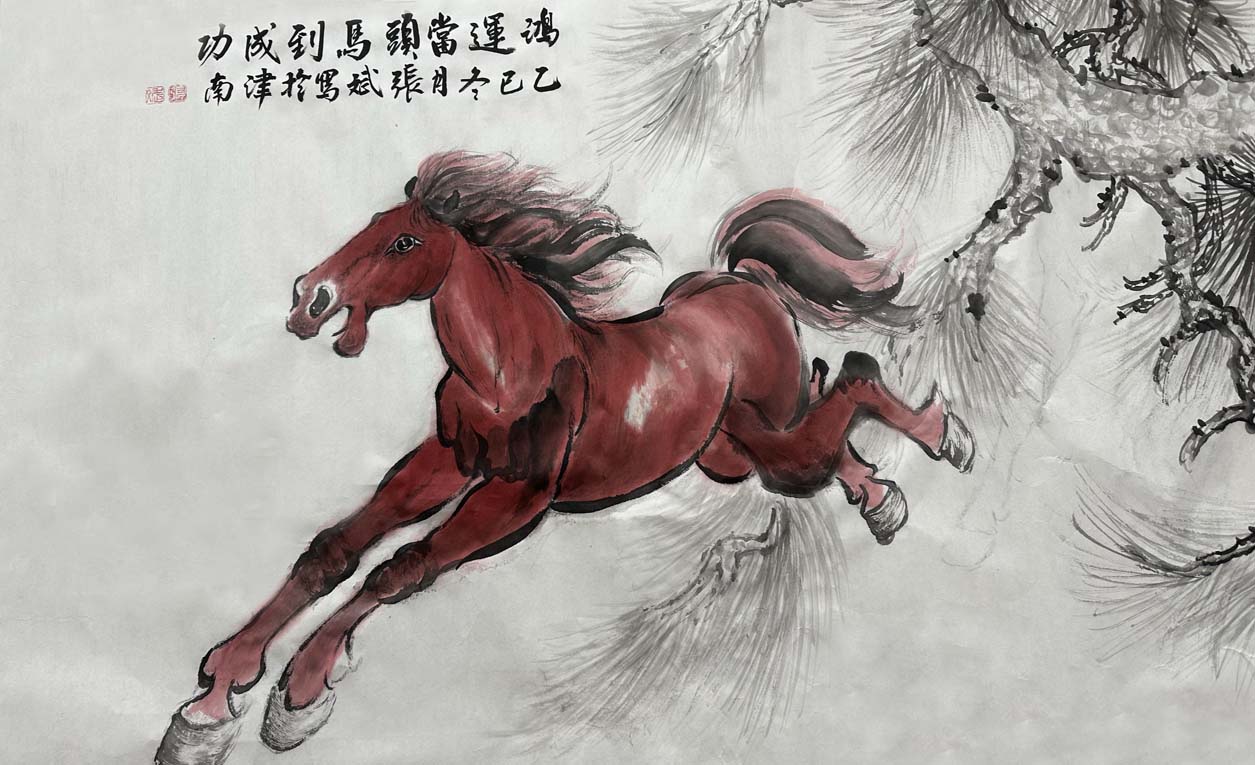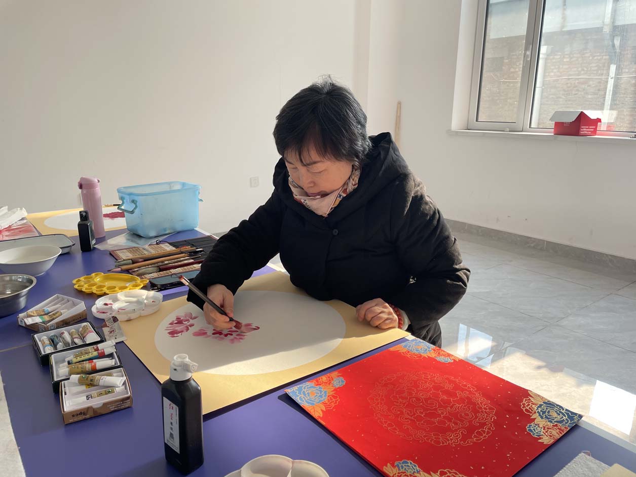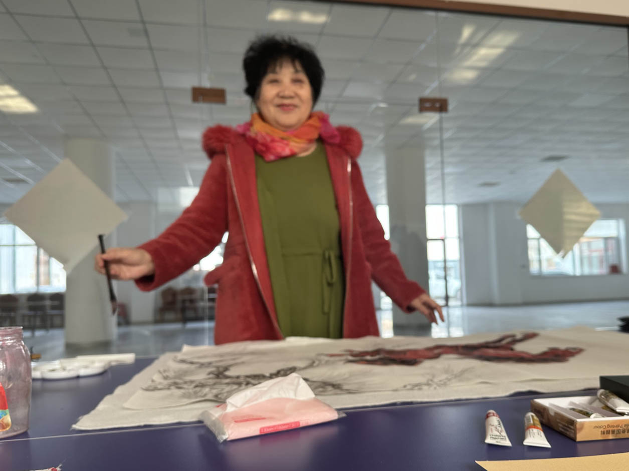 尤为亮眼的是书画院顾问张斌老师她挥毫绘就一匹昂首奔腾的红马,“鸿运当头,马到成功”,寓意新岁顺遂、福气盈门;随后又勾勒出“柿柿如意”的鲜活图景、“竹报平安”的清雅意境与包玉琴,王彦美二位秘书长“富贵牡丹”的雍容姿态,笔墨间尽显功底,每一幅画作都承载着真挚的新春祝福。墨香在现场缓缓弥漫,与田园的清新气息交融在一起。
