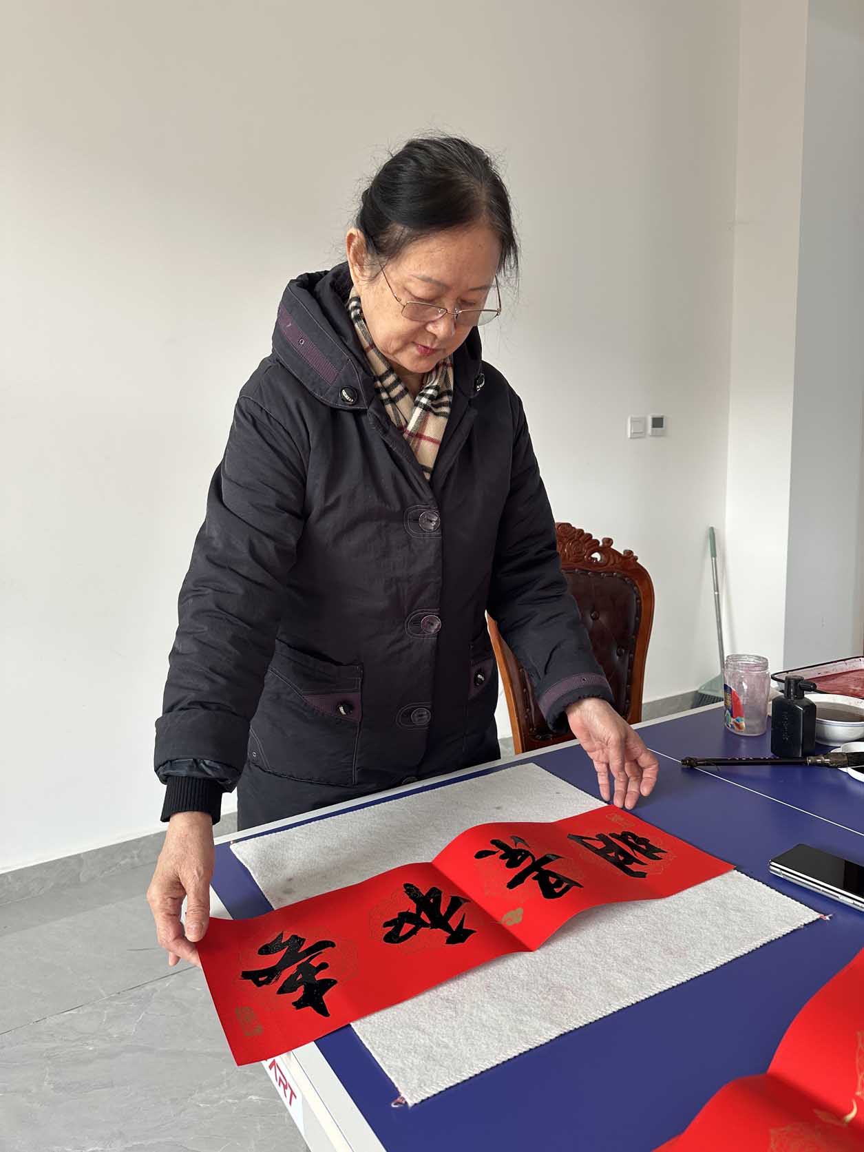 活动现场,大红的春联纸铺展如霞,桃蹊书画院的老师们凝神挥毫,笔锋流转间,一幅幅佳作接连诞生。院长关乃佳的墨宝“花香鸟语大地春,车水马龙家农乐”“马跃神州降瑞气,翁偕儒子度新春”,对仗工整的春联既饱含辞旧迎新的美好祝愿,更巧妙融入农场绿色种植水稻小麦、自家养殖鱼虾的特色,字里行间满是对田园生活的赞美与丰收的期盼。